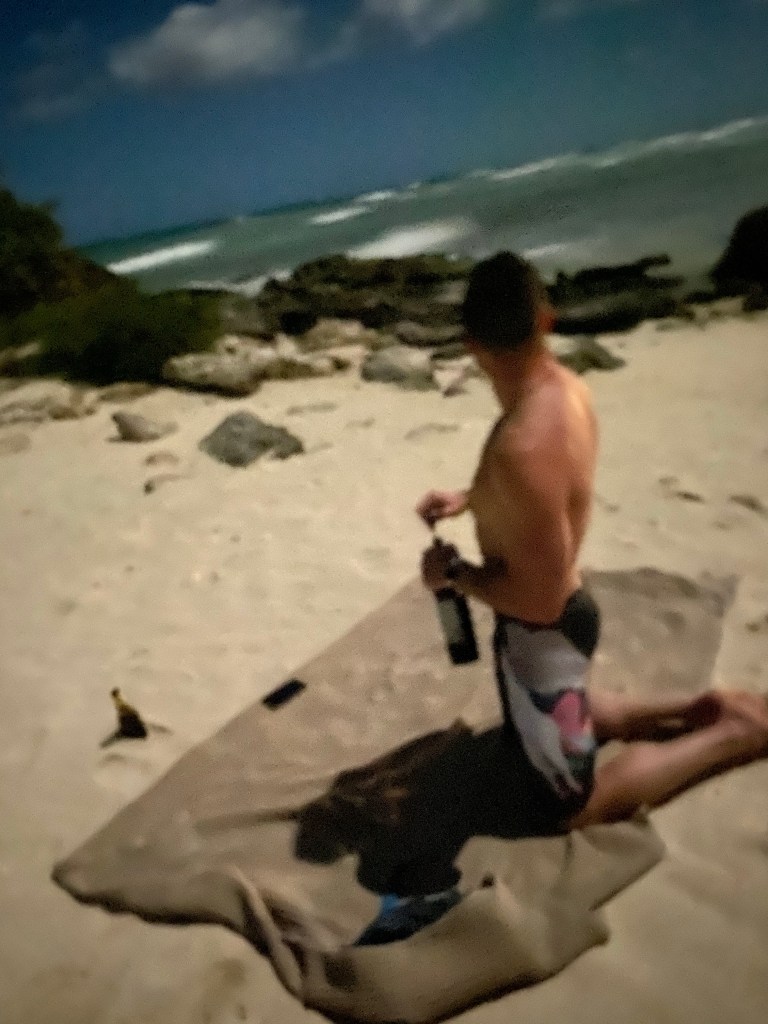 When Brandon took off for his scuba diving lesson, I decided it was time for me to enjoy some recovery time to myself. I found a local gift shop and purchased a $23 bottle of sunscreen (total rip-off, I know, but I didn’t care by this point) and a post-card, addressed it to my girlfriend back home, and wrote a private, intimate message to her. I then headed to the beach and found a lawn chair to lie down on and check my eye-lids for pinholes. The great thing about a tropical beach filled with white people is if you’re wearing a just a swim-suit and a can of sunscreen, then you can loiter for basically as long as you want.